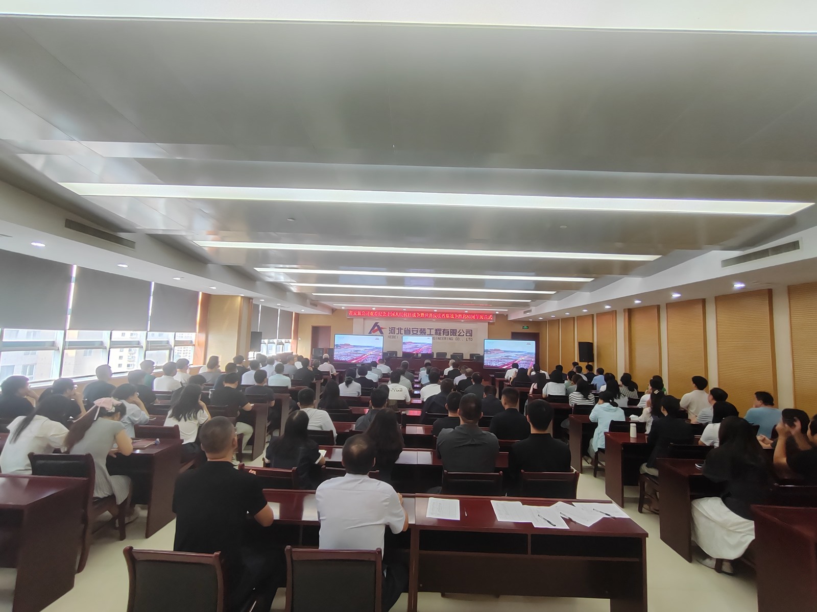 2025年9月3日,為紀(jì)念中國人民抗日戰(zhàn)爭暨世界反法西斯戰(zhàn)爭勝利80周年,河北省安裝工程有限公司積極組織職工集中觀看閱兵盛況直播。公司機(jī)關(guān)及各分公司、項(xiàng)目部共計(jì)2000余人通過多種方式同步參與,共同回顧歷史、緬懷先烈、展望未來。上午9時,習(xí)近平總書記發(fā)表重要講話,9時19分大閱兵正式開始,公司機(jī)關(guān)及各分公司、項(xiàng)目部會議室座無虛席,職工們們整齊地坐在屏幕前,神情莊重地注視著電視畫面。在閱兵式過程中,